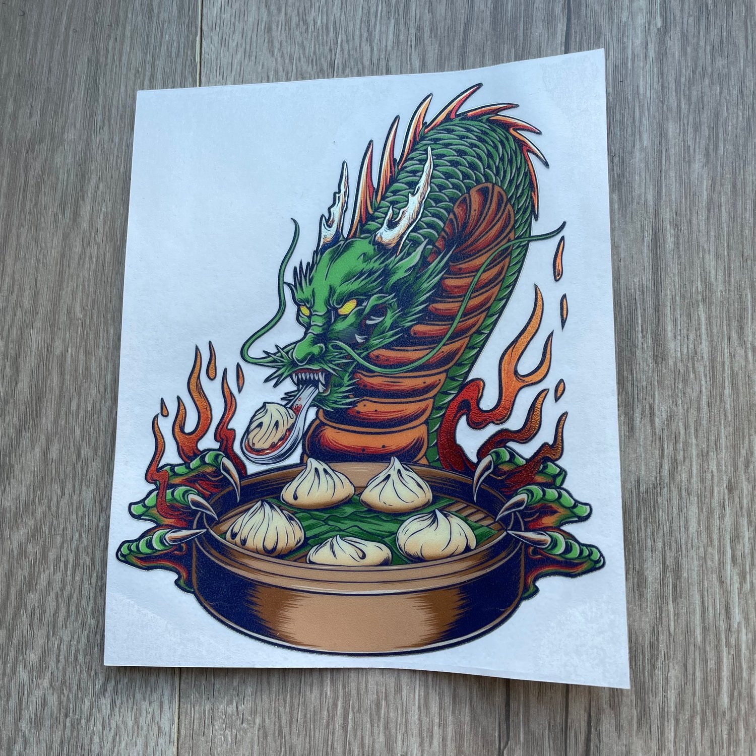 A popular chinese dish called Xiao Long Bao is filled with hot broth and delicious meat. The meaning of Xiao Long Bao means small dragon bun. The packets of delicious soup dumplings are traditionally steamed in a basket. The dumplings resemble pieces of treasure. This design is a play on words where a large eastern styled dragon protects his treasures.